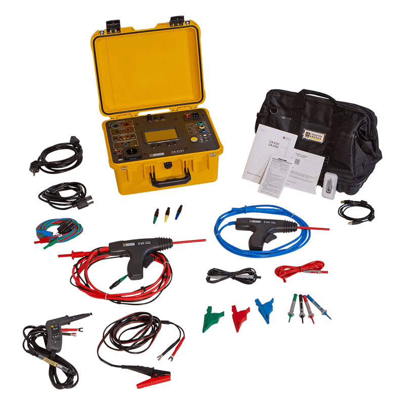 Tester C.A 6163, 2 ks testovacia pištoľová VN sonda 3 m (červená a modrá), dvojitý predlžovací vodič s krokosvorkou typu Kelvin 2,5 m, dvojitý predlžovací vodič s pištoľou typu Kelvin 3 m, 2 ks predlžovací vodič 3 m (čierna a červená ), 3 ks krokosvorka (červená, zelená, modrá), 4 ks merací hrot (čierna, červená, zelená, modrá), 3 ks predlžovací konektor (zelená, žltá, modrá), kábel do zásuvky 2,5 m, kábel trojpramenný 2, 5m, napájací kábel, komunikačný kábel USB, softvér MTT Machine Tester Link, testovací certifikát a užívateľský manuál
