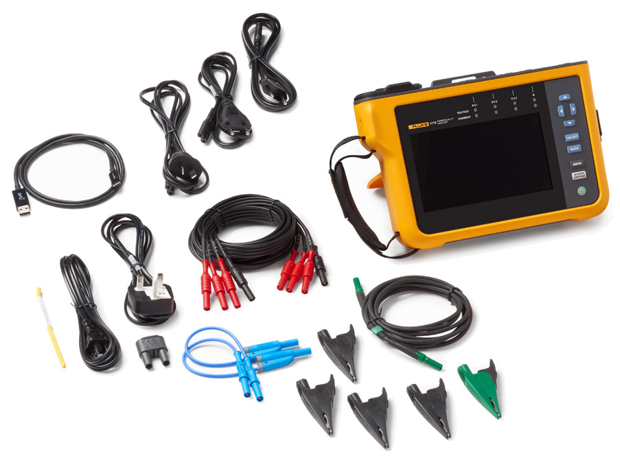 Záznamník Fluke 1773, 4 ks proudové převodníky iFlex i17XX-FLEX1500-18 (45 cm), plochý měřicí vodič 3F+N, 5 ks krokosvorky, 2ks kabel na propojení napájení 0,18m modrý, měřicí vodič zelený, komunikační kabel USB-C, kabel napájení, sada barevných kroužků, adaptér do zásuvky, Energy Analyze Software, návod k obsluze v českém jazyce