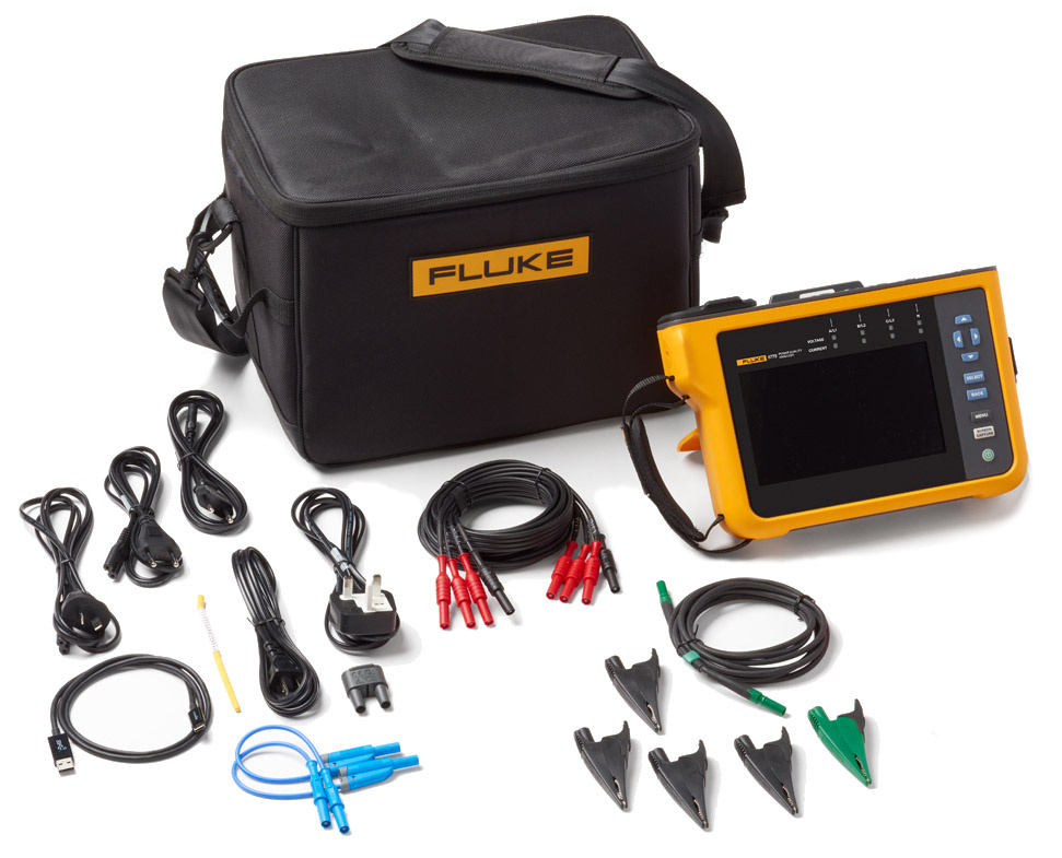 Záznamník Fluke 1775, 4 ks proudové převodníky iFlex i17XX-FLEX1500-18 (45 cm), plochý měřicí vodič 3F+N, 5 ks krokosvorky, 2ks kabel na propojení napájení 0,18m modrý, měřicí vodič zelený, 4 ks magnetické adaptéry, sada magnetického závěsu, komunikační kabel USB-C, Wifi/BLE adaptér, kabel napájení, sada barevných kroužků, adaptér do zásuvky, Energy Analyze Software, brašna, návod k obsluze v českém jazyce