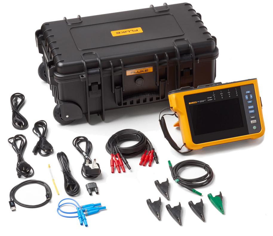Záznamník Fluke 1777, 4 ks proudové převodníky iFlex i17XX-FLEX1500-18 (45 cm), plochý měřicí vodič 3F+N, 5 ks krokosvorky, 2ks kabel na propojení napájení 0,18m modrý, měřicí vodič zelený, 4 ks magnetické adaptéry, sada magnetického závěsu, komunikační kabel USB-C, Wifi/BLE adaptér, kabel napájení, sada barevných kroužků, adaptér do zásuvky, Energy Analyze Software, kufřík, návod k obsluze v českém jazyce