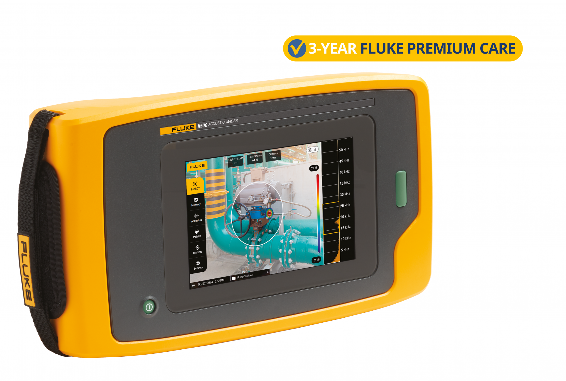 Ruční akustická průmyslová kamera Fluke ii500, vybavená soustavou mikrofonů zajišťujících široké zorné pole, umožňuje pracovníkům údržby rychle a přesně zjišťovat místa úniků vzduchu, plynů a podtlaku v systémech stlačeného vzduchu, a to i v hlučných prostředích.