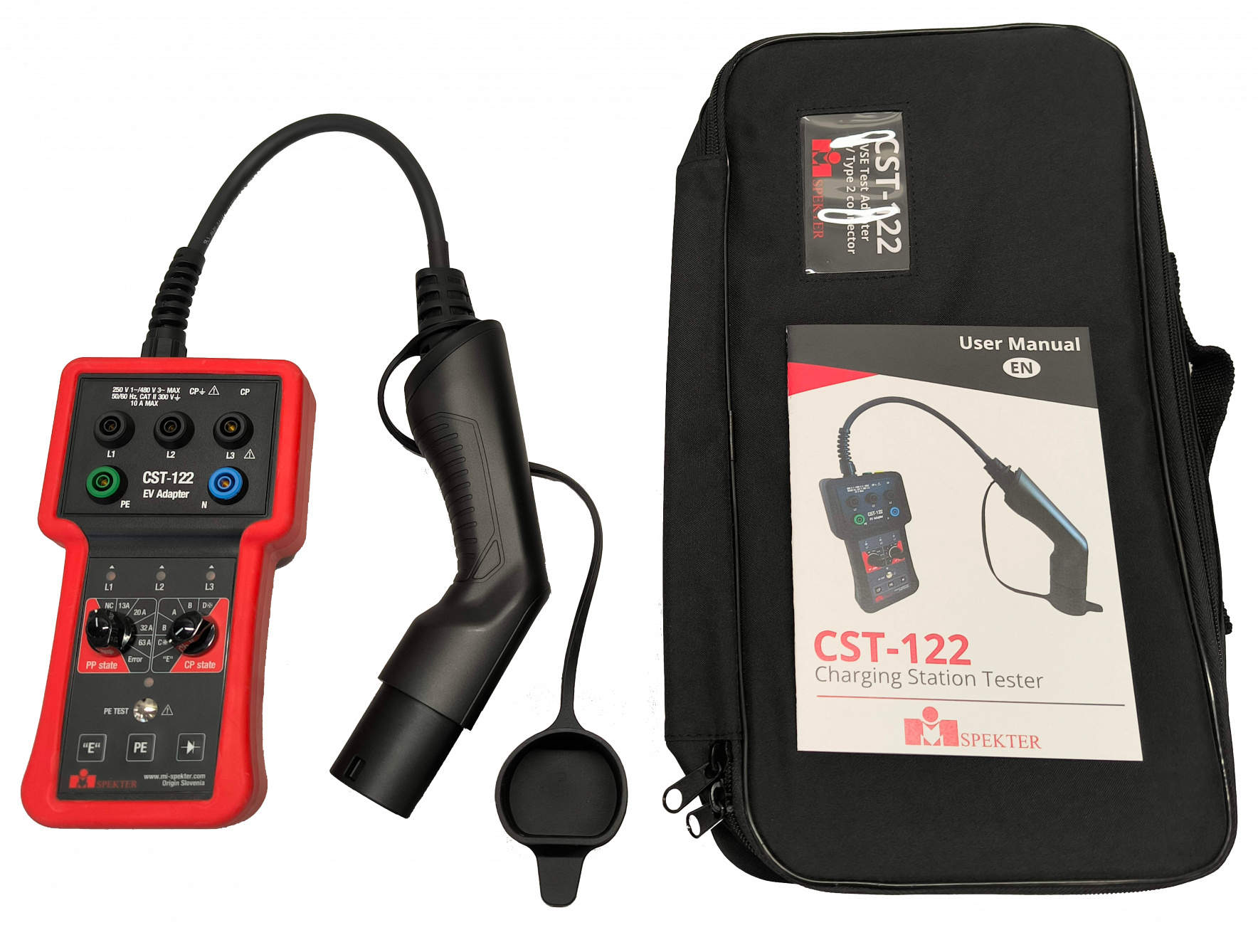 Chcete‑li se připojit k nabíjecí stanici pro elektromobily typu 2 se zásuvkou nebo se připojit k nabíjecí stanici typu 2 s konektorem vozidla, použijte zástrčku typu 2. K zajištění maximálního dostupného proudu pro dobíjení lze provádět různé testy včetně kontroly zemního spojení, izolace vodičů, měření napětí a činitele využití (střídy), a to vše pomocí jednoho adaptéru. Adaptér CST-122 umožňuje simulovat chybový stav signálu CP (E) a PE (zemní spojení). Ke snadnému zjištění přítomnosti napětí nabízí samostatný ukazatel fází třemi kontrolkami. Kvůli odstraňování závad nabíjecích stanic není nutné přivážet na pracoviště elektromobil: adaptér při připojení k nabíjecí stanici simuluje elektrické vozidlo a umožňuje snadné testování provozních vlastností a provádění údržby.